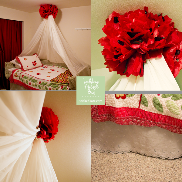 Here is one of my recent projects that I am proud of: a ladybug princess canopy for Girl’s bed. Girl sleeps on a bed that was my husband’s when he was little. While wonderful, it is very masculine. In fact, it is going to become Boy’s when he turns 18 months. Anyhow, to girlify it, I made bumpers from fabric and interfacing that were green, and then I used two chiffon swags that I bought for five bucks at Goodwill to make a canopy. Finally, I made and hung two large red tissue paper pom-poms. I used my ginormous Sharpie marker to put spots on the paper prior to making the poms to make them ladybug-esque. I also took some scrap lace-style fabric and pinned it under the mattress on the long side of the twin bed to be used as a bed skirt. Girl loves it! I think it really adds something to the room, and it makes it much more girly for my little princess. I got the idea for the pom-poms on Pinterest (this pin) and StyleberryBlog. The pieces are hung by a regular anchored plant-hanging ceiling hook. I purchased the ladybug quilt online (here) two years ago for her big Birthday gift. In a few months when we move, I will purchase the full sized version of this set. Then she can simply get her “princess” rehung, and she will be right at home in our new location.