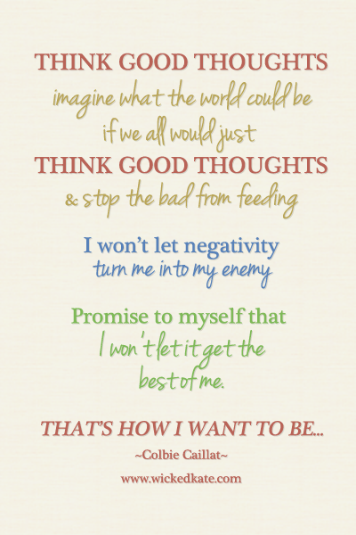If we want people to be positive around us, we must be positive around them. To do that, we must be positive within ourselves. Negativity can quickly turn me into my own enemy if I listen to the things my imagination can come up with, there are some great monsters that exist only in my head that serve only ruin my day. These monsters feed on bad thoughts and put me in a tailspin. Consciously try to think more positively today. It really makes a difference. Oh, and if you’re looking for a catchy song that is upbeat the song is called Think Good Thoughts by Colbie Caillat. Enjoy.